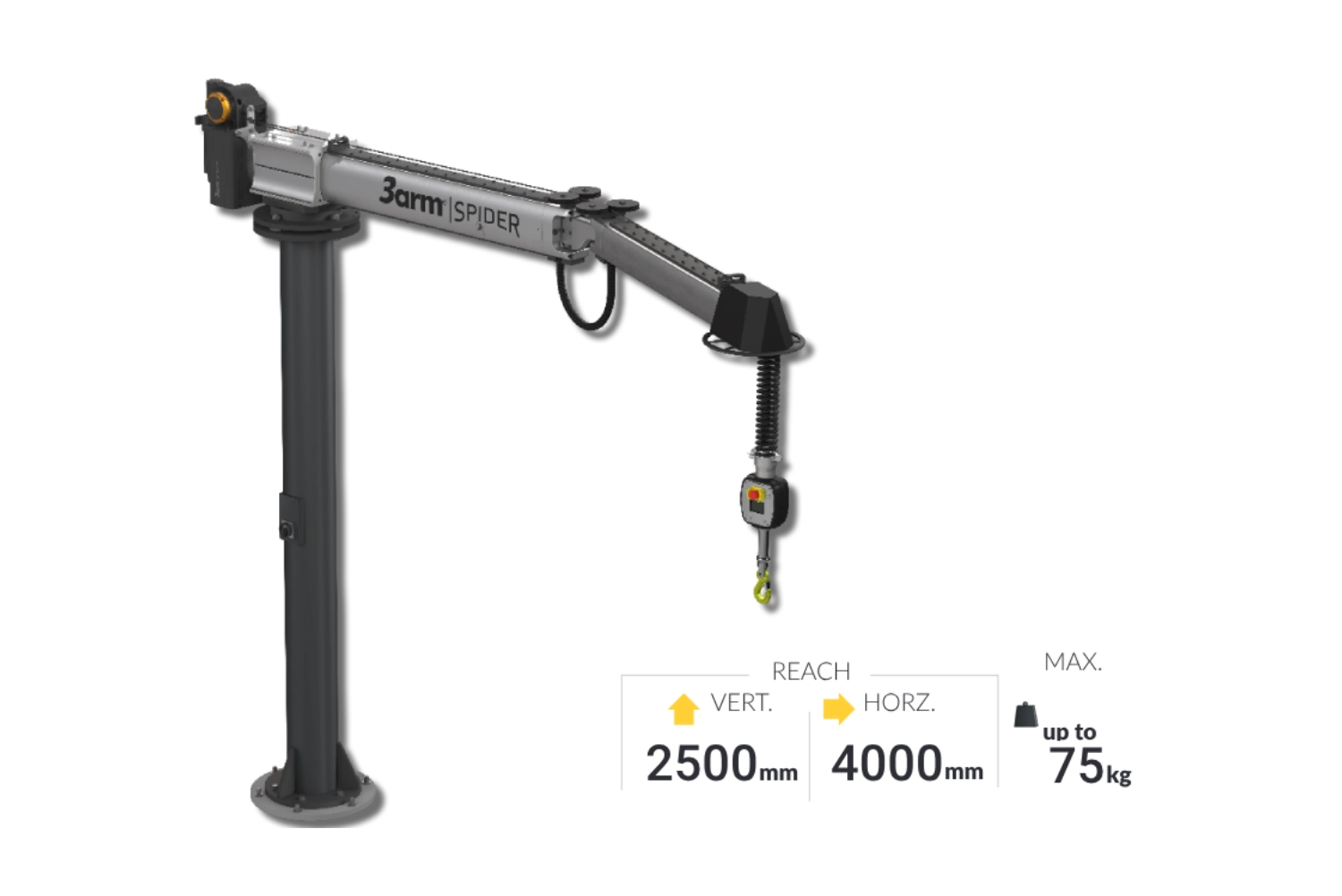 3ARM® Spider 75C 為一款電子式機械助力臂,專為人體工學搬運與高精度物料處理而設計,最大負載能力達 75 kg。本設備採用立柱安裝結構,搭配雙徑向旋轉臂(Dual Radial Arms)設計,可在大範圍作業半徑內實現流暢的無重力控制、高速升降與精準定位。