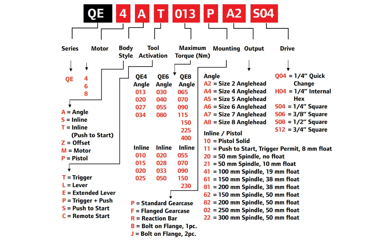 | 描述 | QE4 彎角扳手耐用且速度快,扭力範圍 0.3 Nm 至 400 Nm,轉速達 1,200 rpm,適合各種緊固需求。 | QE4 直式工具具備高耐用性與人體工學設計,適用於多種鎖付應用。 | QE4 槍式工具手持式設計,耐用且速度快,適合各種鎖付需求。配備一系列功能,旨在提高生產力且不分心。 | QE4 下壓啟動工具耐用性高,配有連接叉附屬裝置,易於連接扭力臂,操作空間可見性高。 |